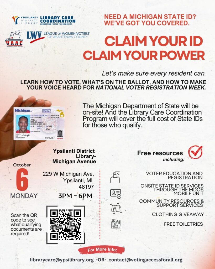 Having the right identification should never stand between you and your right to vote. That’s why Voting Access for All is proud to co-host Claim Your ID, Claim Your Power with the Ypsilanti District Library during National Voter Registration Week. This community event is designed to remove barriers, provide resources, and ensure every resident has what they need to fully participate in democracy.