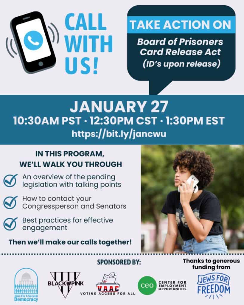 On January 27th at 1:30pm Eastern (12:30 pm Central, 10:30am Pacific), VAAC is co-sponsoring an easy, virtual, and vitally important ACTION event, “Call With Us: Board of Prisoners Card Release Act (IDs upon release)“ Withholding IDs is a voter suppression tactic and a criminal justice and economic justice issue with Jews for a Secular Democracy, Black and Pink, and the Center for Employment Opportunities (CEO).