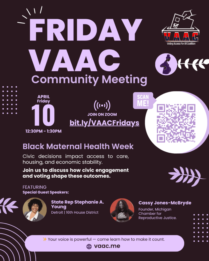 We will be welcoming Cassy Jones-McBryde, Founder of the Michigan Chamber for Reproductive Justice, and State Representative Stephanie A. Young, as our guest speakers. State Representative Young currently serves as Chair of the Detroit Caucus and House Democratic Caucus and has led legislative work focused on families, children, and community health.