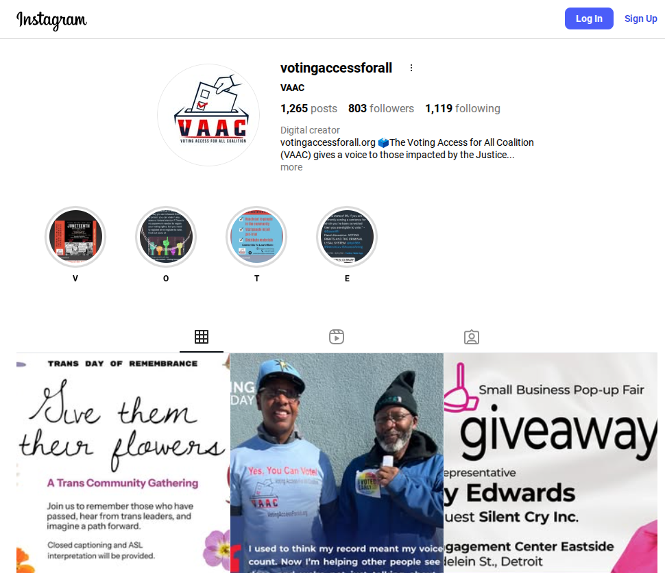 Community power grows when we share information, uplift each other’s voices, and stay connected. Thanks to your support, VAAC has officially reached 803 Instagram followers, and we could not be more grateful. Every like, share, comment, and repost strengthens our collective work to protect voting access across Michigan.