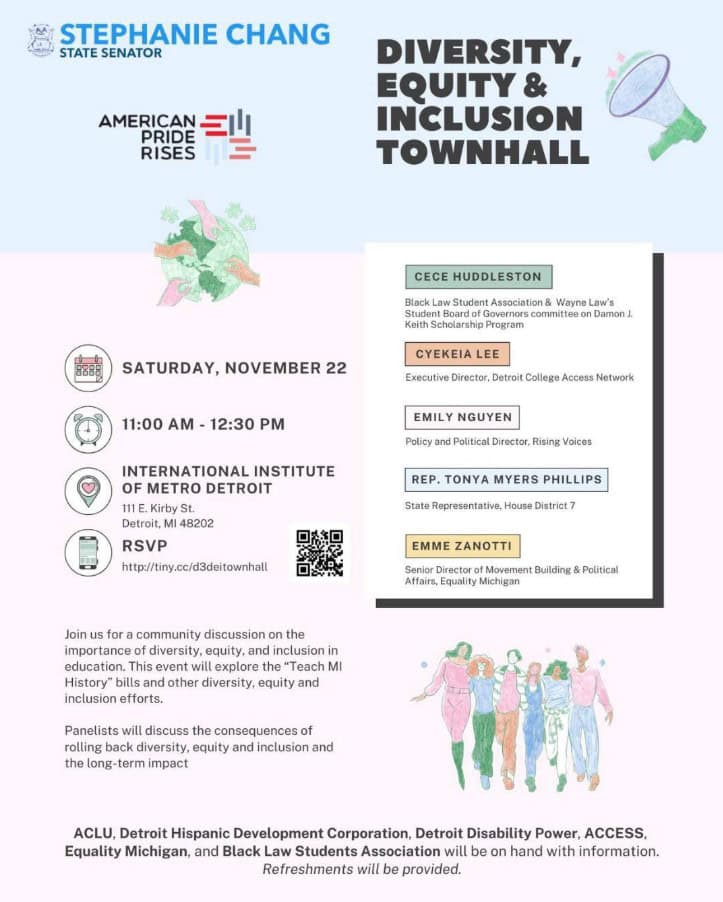 Presentado por la senadora Stephanie Chang y American Pride Rises, el evento contará con panelistas que trabajan a diario para ampliar el acceso a la educación, fortalecer los sistemas de apoyo comunitario y proteger los derechos civiles. Los asistentes explorarán las amenazas actuales a las iniciativas de DEI y debatirán cómo los ataques a la DEI perjudican directamente a las comunidades de todo Michigan.