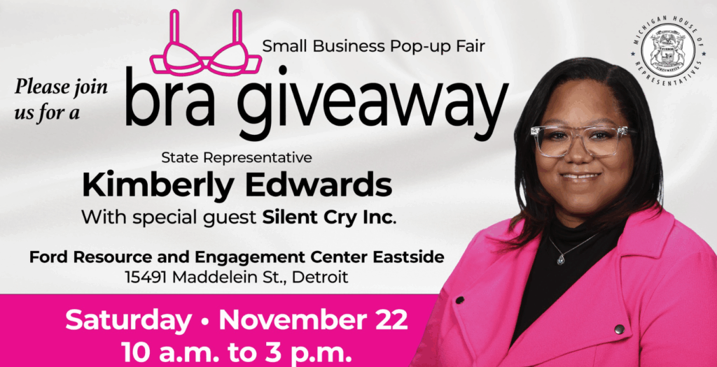 Strong communities grow through connection, support, and shared resources. This weekend, State Representative Kimberly Edwards is hosting a Small Business Pop-Up Fair and Bra Giveaway featuring Silent Cry, Inc., bringing local entrepreneurs and essential supplies together for Detroit residents.