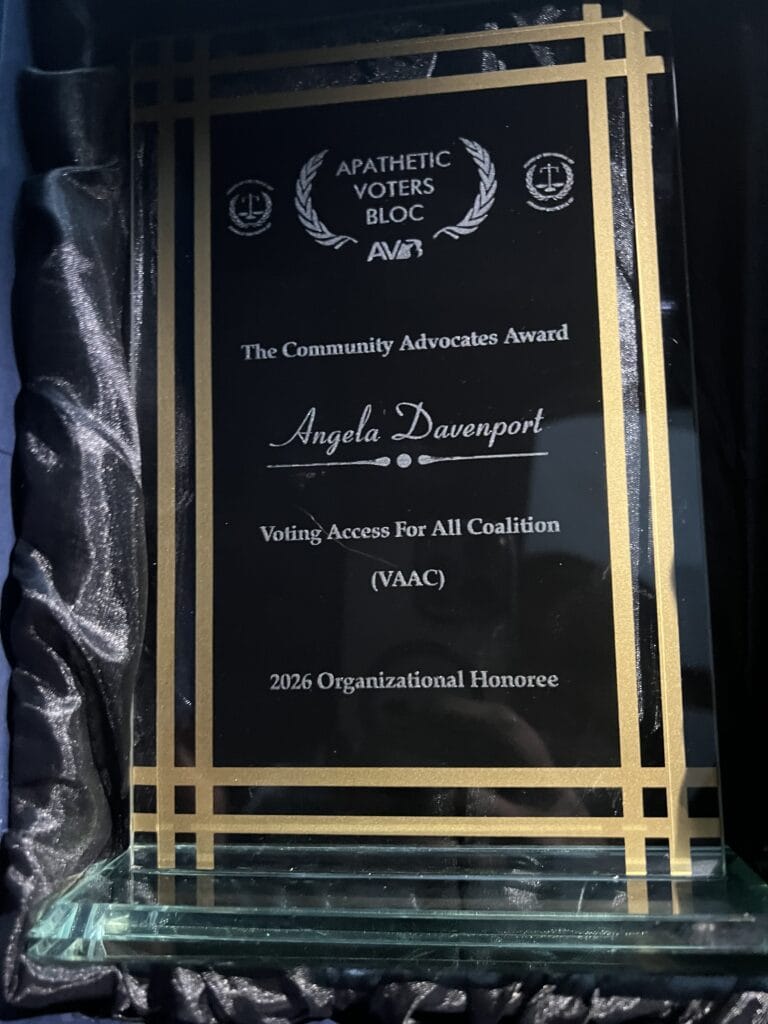 Last week, Voting Access for All Coalition (VAAC) was named the 2026 Organizational Honoree for the Community Advocates Award by the Apathetic Voters Bloc.