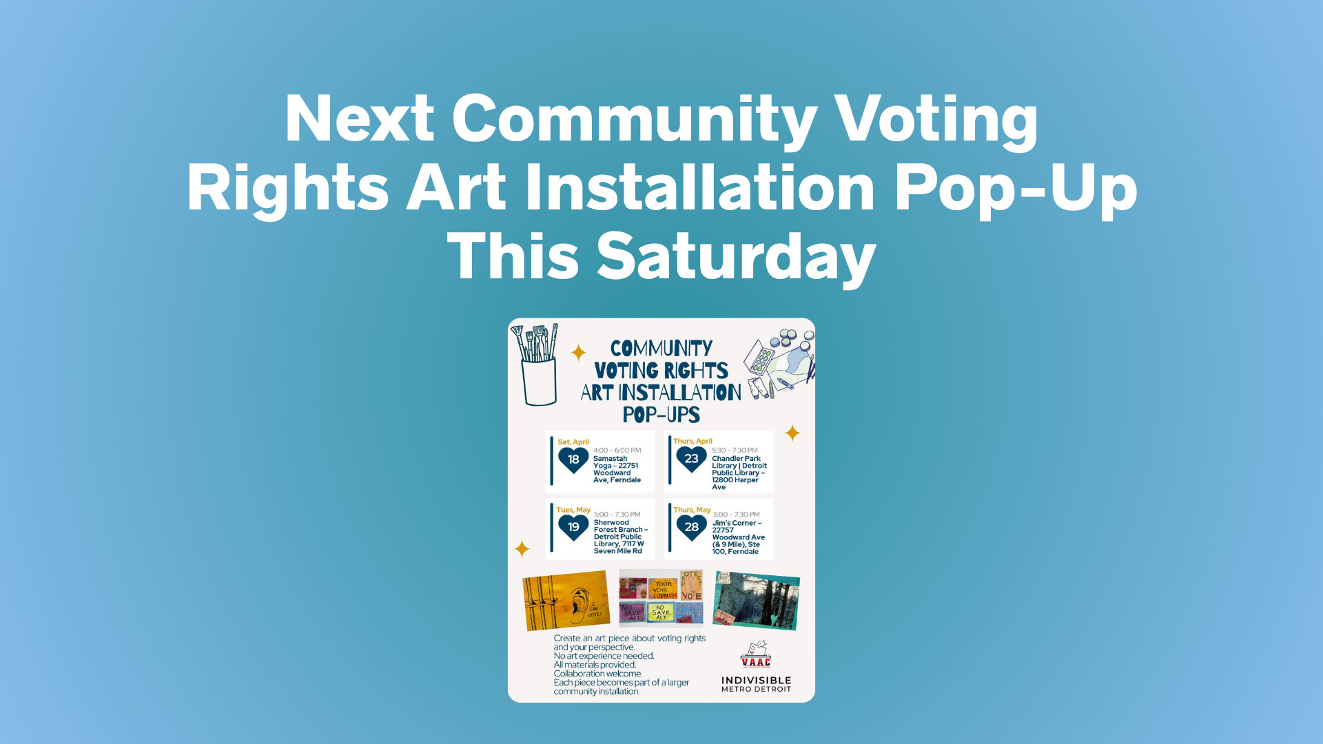 La Coalición por el Acceso al Voto para Todos (VAAC), en colaboración con Indivisible Metro Detroit, organiza encuentros comunitarios donde los participantes crean pequeñas obras de arte sobre el derecho al voto, incluyendo experiencias personales y obstáculos para votar. Ya se han realizado dos eventos, y cada vez se suman más personas. Las próximas fechas están abiertas a todo aquel que desee participar.