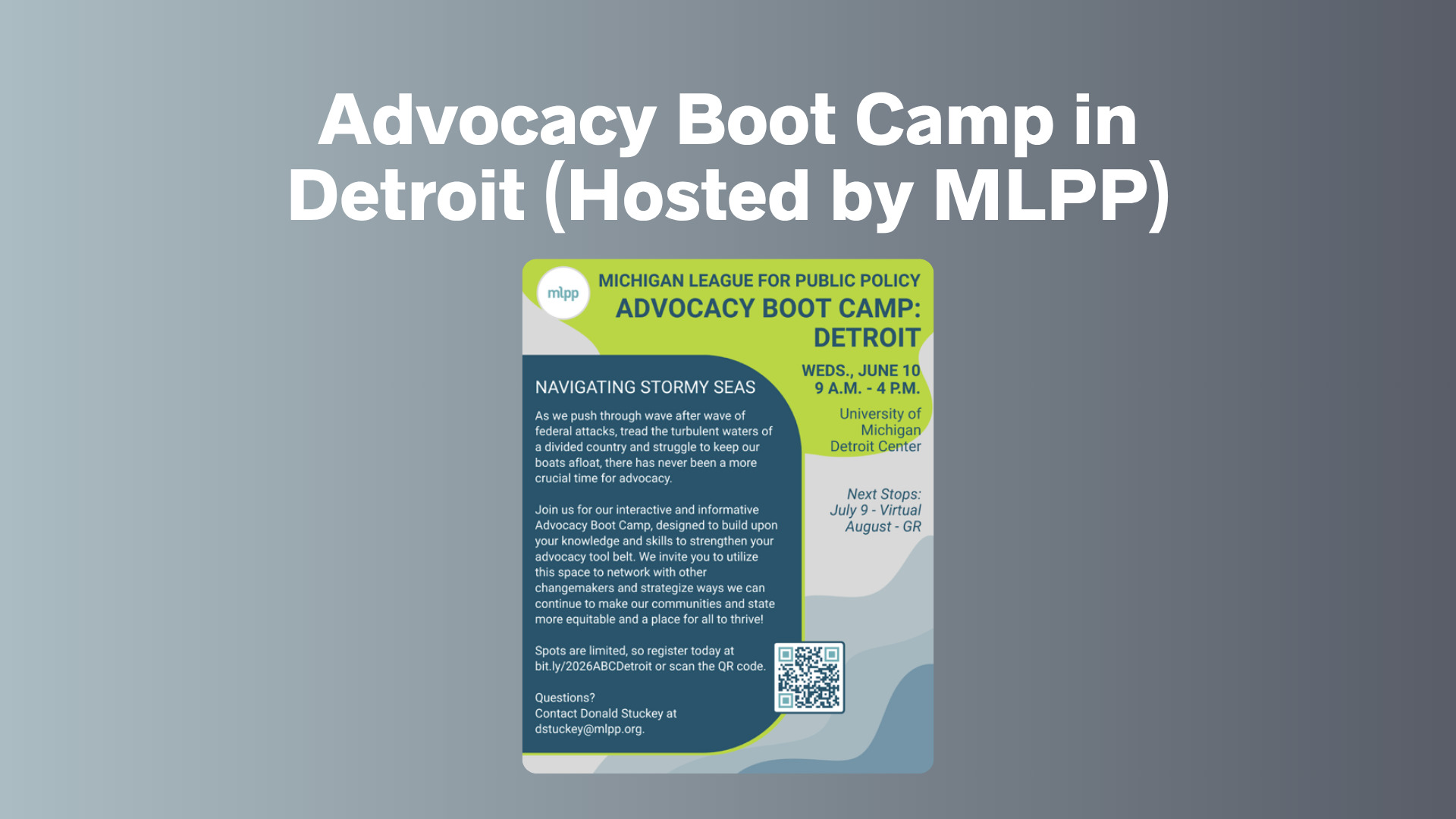 The Michigan League for Public Policy is hosting a free, in-person Advocacy Boot Camp in Detroit. Space is limited to 50 participants.